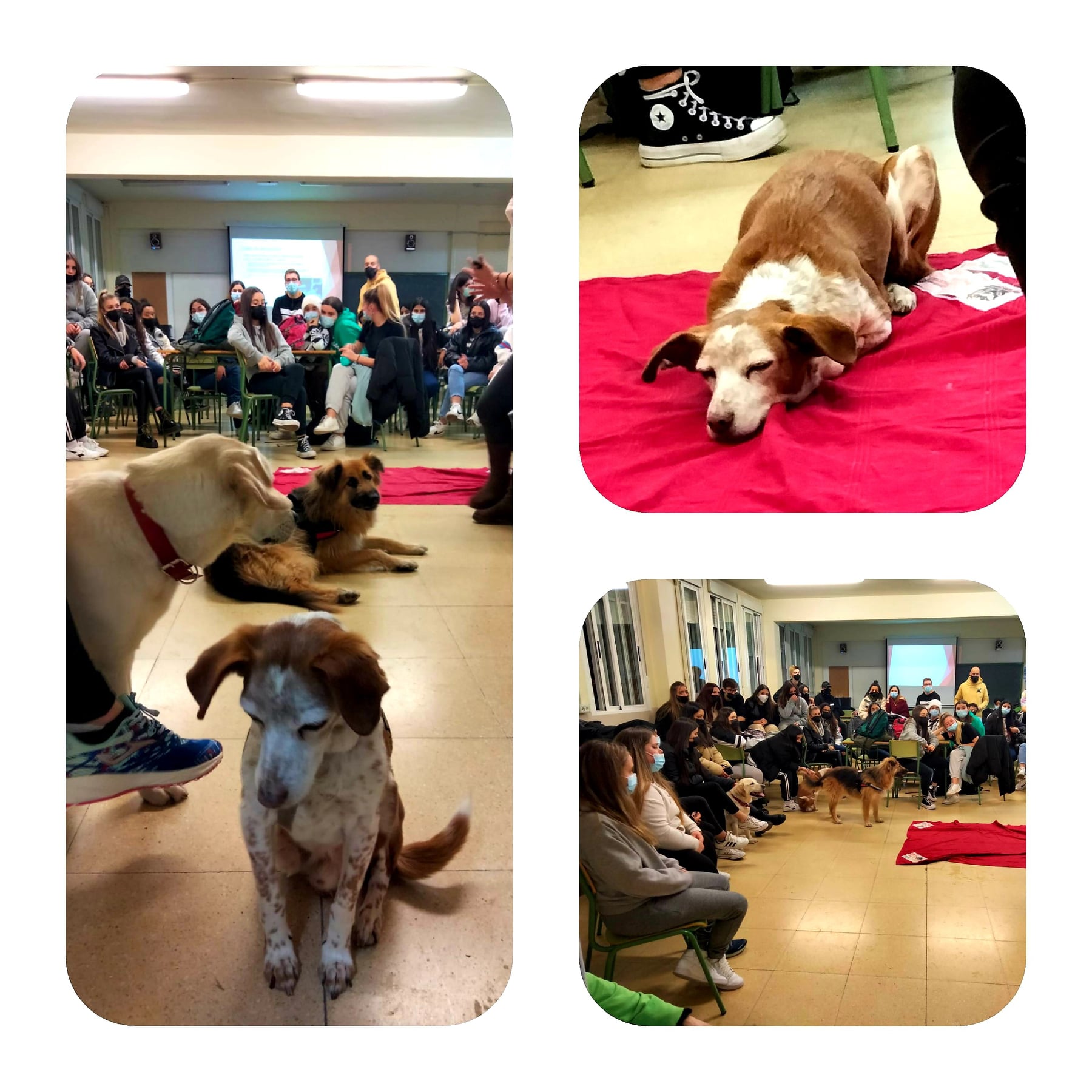 “La asociación APRENDE CON LAIKA asistió a nuestro instituto el 14 de febrero para impartir un taller de terapia con perros. Acudieron dos profesionales instructoras de perros, Nerea y Raquel, para que viésemos cómo trabajan con ellos. Los perros se llaman Laika (labradora) y Lennon (pastor alemán cruzado). También asistió Cali, un perro con ceguera que nos hizo compañía durante las dos sesiones.