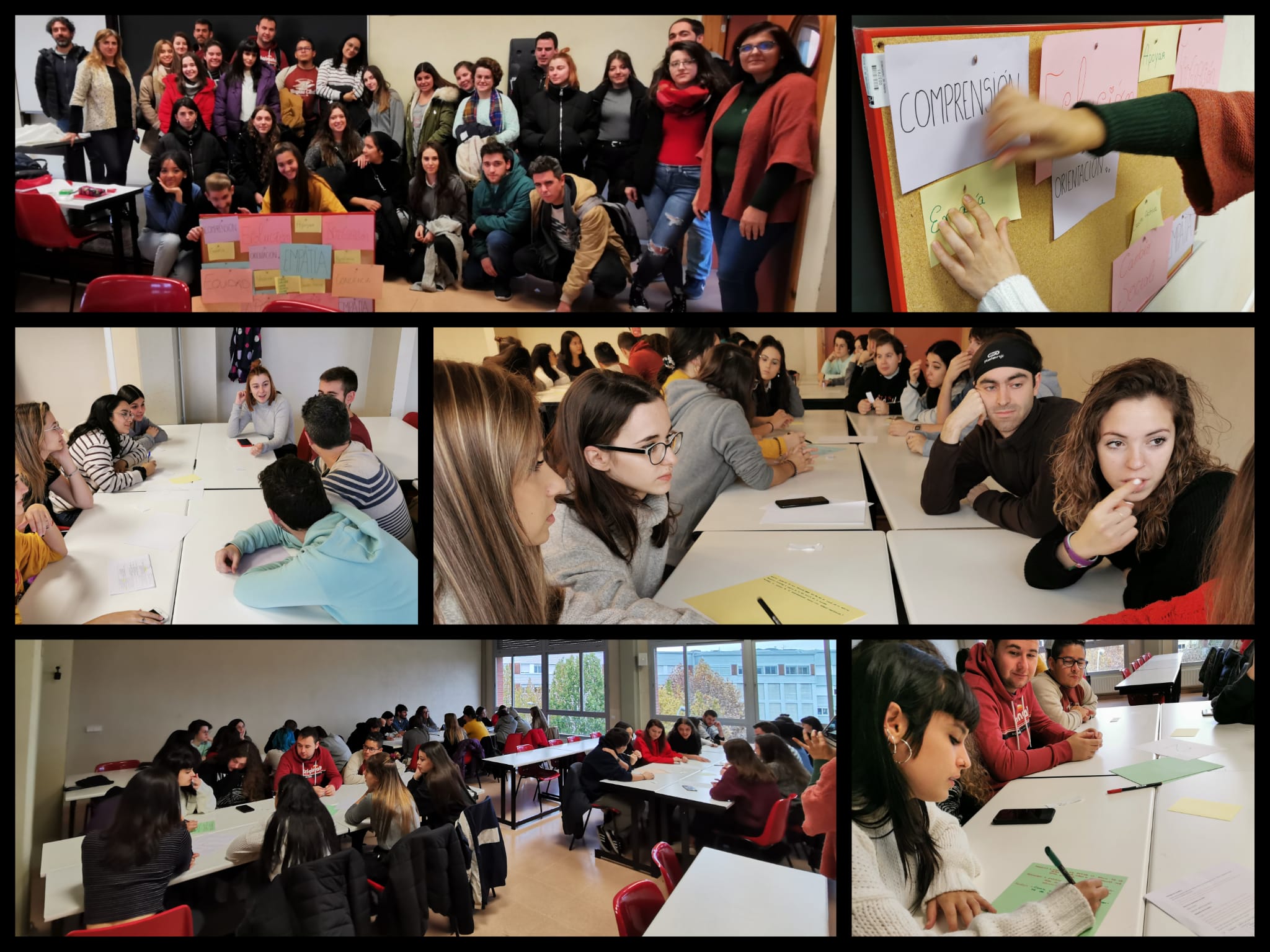 La mañana del día 22 de noviembre, el alumnado de "1º y 2º de Integración Social" ha compartido aula con el alumnado de "Trabajo Social" en la Universidad de La Rioja. Durante la sesión han debatido y reflexionado sobre el concepto de Trabajo Social y su reconocimiento en la sociedad. Para terminar han elaborado un mural con palabras que definen este ámbito. Ha sido una dinámica muy satisfactoria ya que ha permitido acercar a futuros profesionales que con mucha seguridad trabajarán mano a mano.